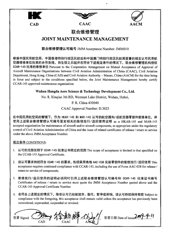 2001年10月 公司獲中國民航總局授權的民航維修許可證。